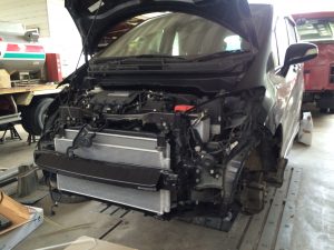 フリードの板金修理のご紹介です。I様のフリードをフロント回りの損傷でお預かりしました。エアバックは開きませんでしたが、フロントの骨格が変形しボンネットに折れ、コアサポートと共にラジエーターも歪んでいました。