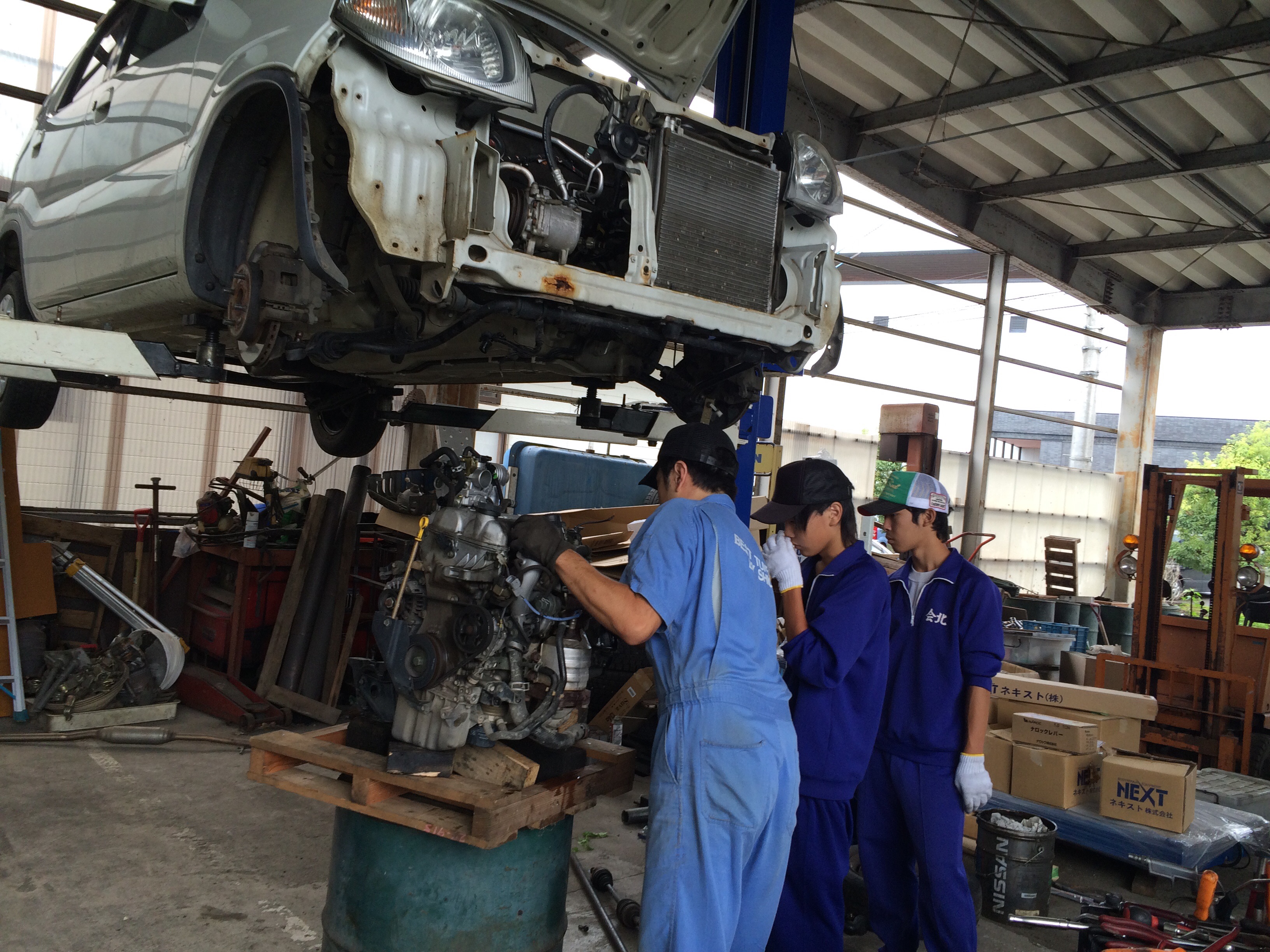 S様のKEIのエンジン交換、T社様のエルフの車検等、板金塗装など見学しながら手伝ってもらいました。